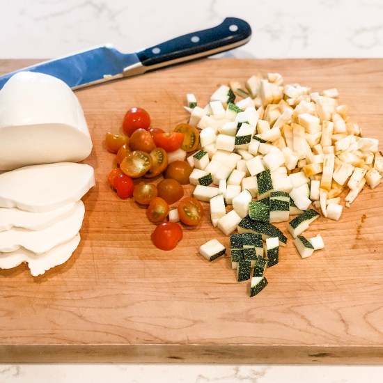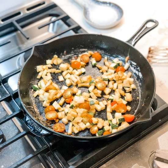 6. Remove chicken from pan and set it aside. Don’t rinse out the skillet. Add remaining tablespoon of oil and toss in zucchini, squash and tomatoes. Saute for 3-4 minutes, just until veggies start to soften and tomatoes pop.
