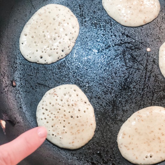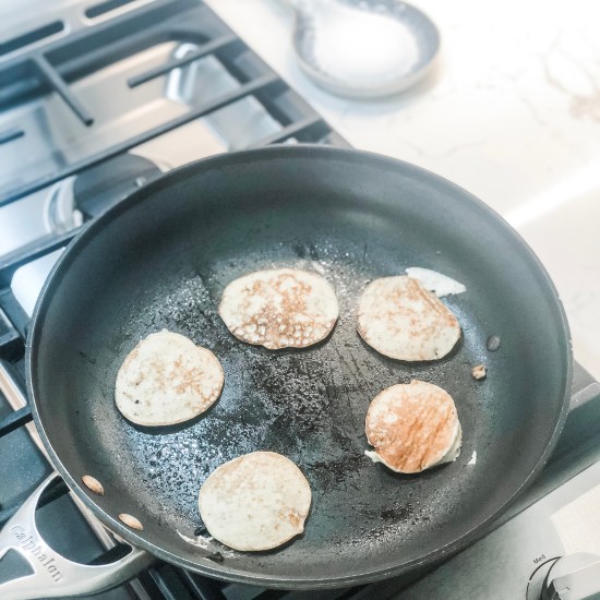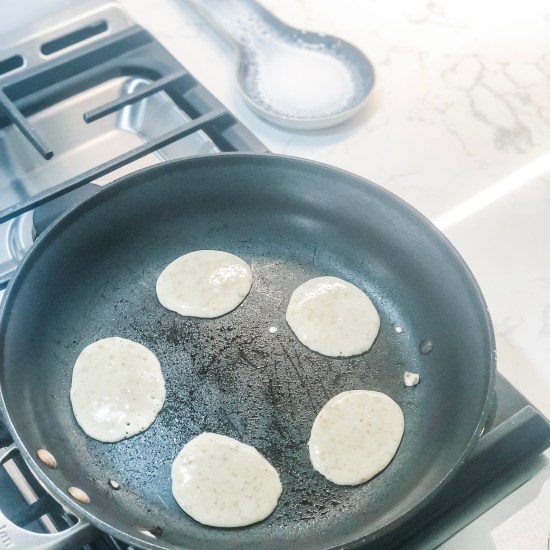 In a large frying pan prepared with cooking spray, add 1-2 tablespoons (don’t make them bigger or they’ll fall apart when you flip them) of pancake batter to pan and cook over low heat (these cook quickly!). You’ll know when to flip them when they begin to bubble (see picture below).
