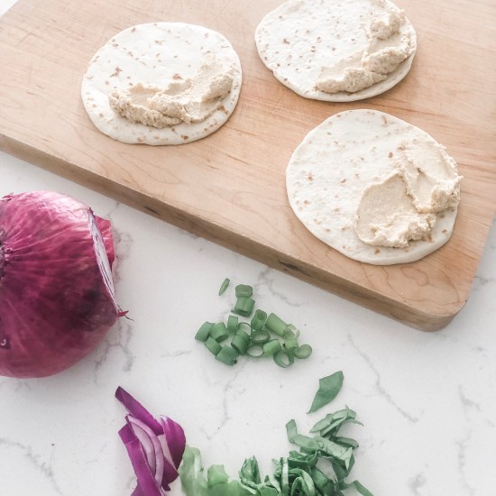 - To prepare the tacos: spread 1-2 tablespoons on half of each taco shell. Add 4-6 steak bites on top of the hummus. Add lettuce, red onion and spring onion to each taco and seal the other side of the taco with a smear of hummus.