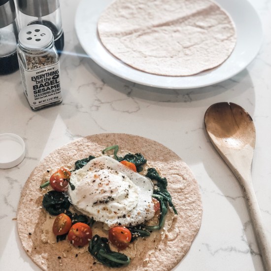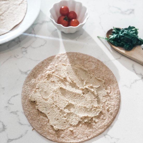 - While eggs are cooking, prepare the wrap: line the whole wheat wrap with hummus. Top with spinach and tomatoes and season generously.