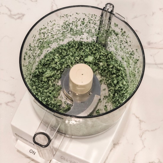 - In a food processor, blitz broccoli stems until riced (alternatively, you can use pre-riced broccoli). Add in carrots, spinach, parsley and shallot and blitz until combined.
