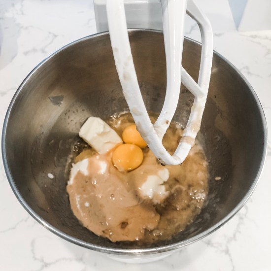 2. Combine banana, yogurt, tahini, butter, vanilla & eggs in a large bowl; mix until well combined. Add sugars and mix until combined.