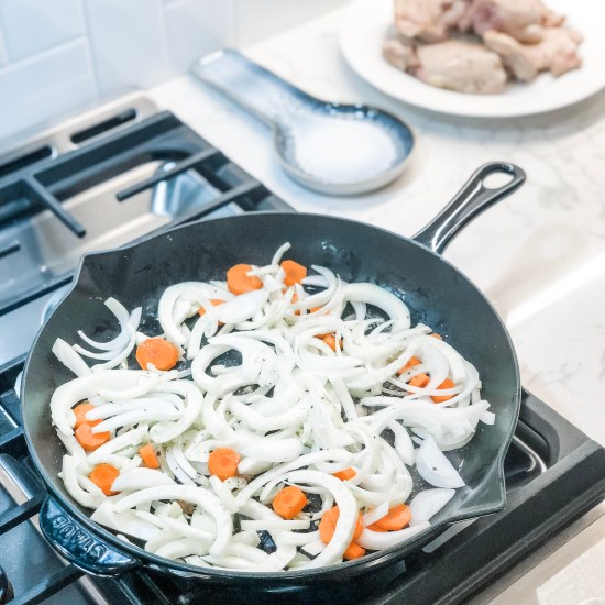 I’m so in love with Fall flavors so a teeny part of me was excited to make this for dinner. It comes together quickly and half of the cooking time is hands off time, which is ok in my book! A quick sear of the chicken, a sautee of the veggies and a mix of it all together in a sauce and it’s done! Details below!