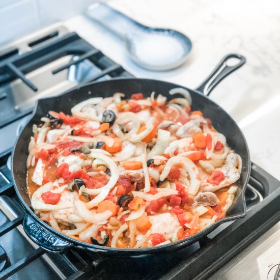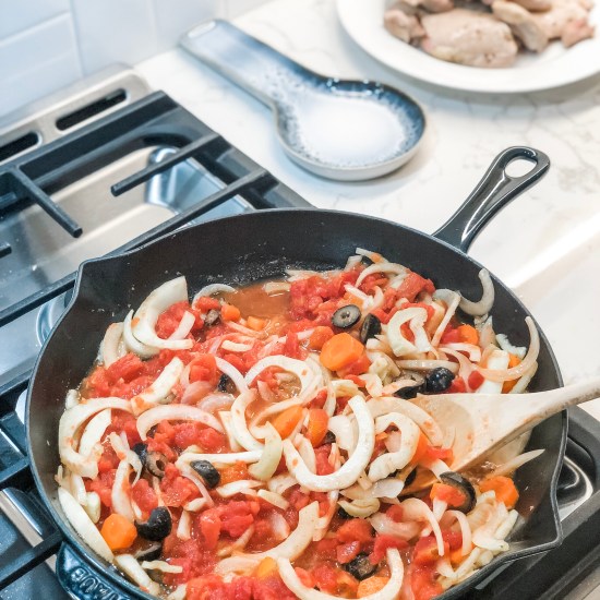 - Add sliced fennel, onion, and carrot to same pan; cook 3 minutes. Add cinnamon and cook 1 minute. Add orange juice, olives, and tomatoes. Increase heat to high, and bring to a boil. Add chicken and accumulated juices to pan. Reduce heat to medium, and cook 20 minutes or until chicken is done.