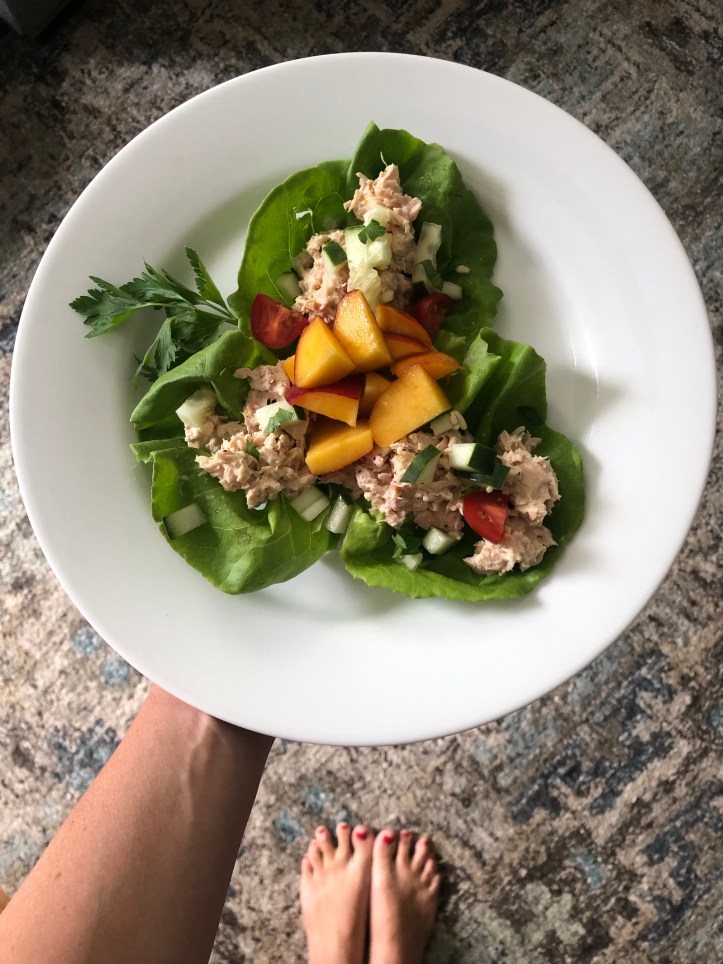 Today, we made it a little more traditionally with mayo and mustard and topped it with a nectarine because, why not! That’s what the girls wanted so that’s how we ate it. And they just love eating it in lettuce leaves. Well, I should say holding it in lettuce leaves. It’s very rare they actually eat the greens but sometimes, they get a bite or two of it.