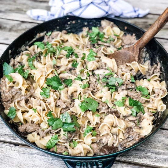 So this week, when I found myself with yet another package of ground meat, I wanted to try something other than meatballs. After doing a little digging, I decided to make beef stroganoff with it. Typically, you use some kind of stew meat (like I did here) when you make it. But, I made it tonight with ground meat and I’m probably going to make it this way from now on.