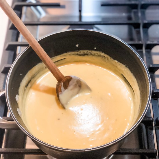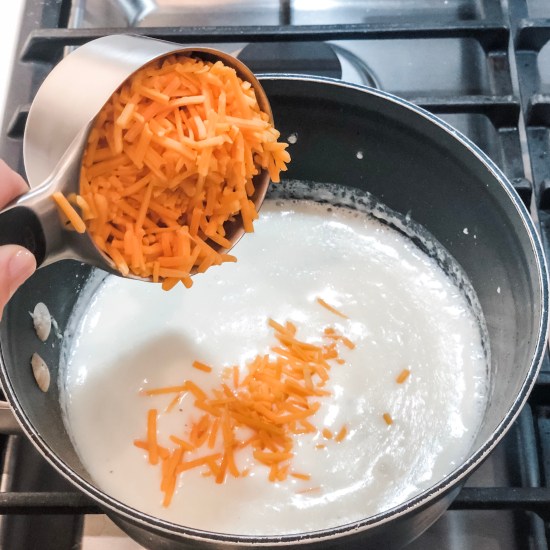 - In a separate small saucepan, melt butter. Stir in the flour, salt and pepper until smooth. Gradually add milk and whisk. Bring to a boil over medium heat; cook and stir for 2 minutes or until thickened. Reduce heat. Stir in the cheese until melted.