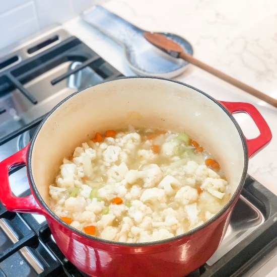 - In a Dutch oven, combine the cauliflower, carrot, celery, water and bouillon. Bring to a boil. Reduce heat; cover and simmer for 12-15 minutes or until vegetables are tender (do not drain).