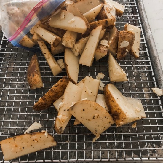 - In a large Ziploc bag, combine spice mixture, potatoes and olive oil. Toss until coated. Place potatoes on a rack inside a baking sheet making sure they don’t overlap.
