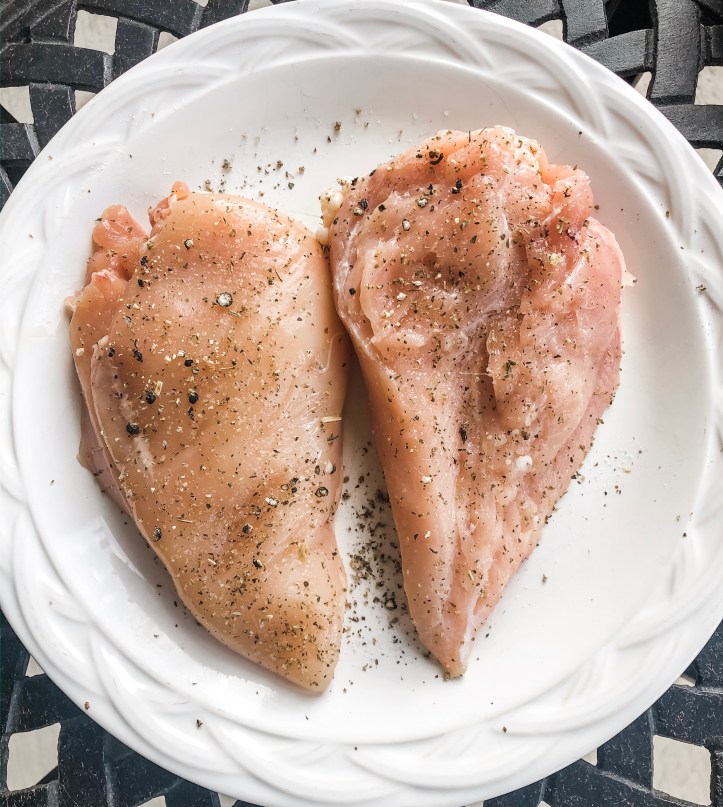 - On a large cutting board, butterfly each chicken breast and season generously with lemon herb seasoning, salt & pepper.