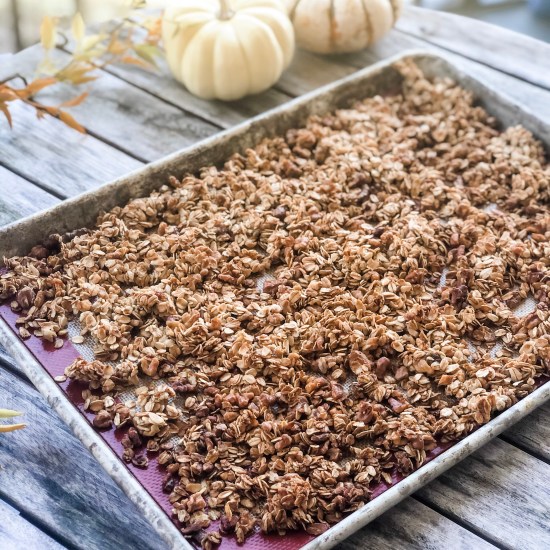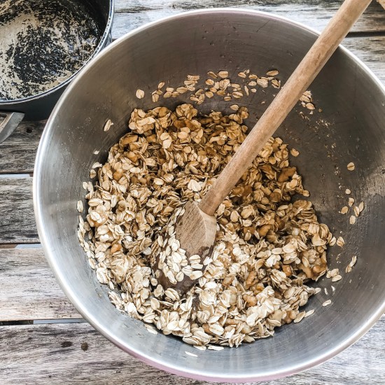 In a large bowl, mix together the oats, nuts, salt, pumpkin pie spice and flax/chia seeds.
