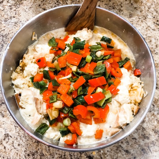 - Make the custard: Whisk the eggs, chicken broth, half-and-half, 1 teaspoon salt and a few grinds of pepper in a large bowl. Add the creamed corn, bread cubes, 2 cups cheese, the scallion greens and poblano mixture; toss gently until combined. Let sit until the bread is soaked, at least 30 minutes.