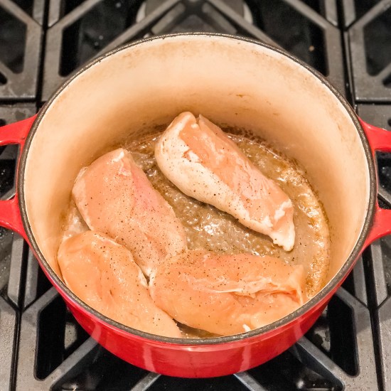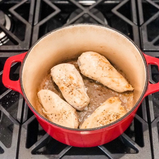 - Drain the oil from the jar of artichokes and add 1 tablespoon to a flameproof casserole dish. Add half the butter, then place on the hob to heat. Season the chicken breasts, add to the dish, skin-side down, and cook for 2–3 minutes until lightly browned. Turn over and cook for another minute or so until sealed. Transfer to a plate and set aside.