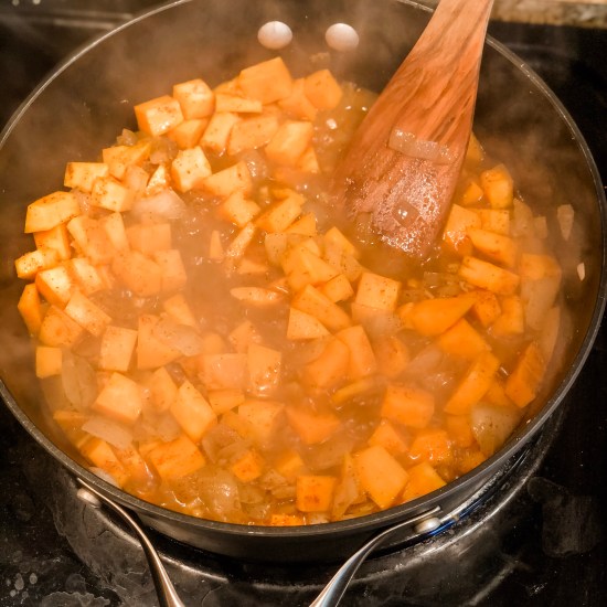 - Add the sweet potato and stir to combine with the onions. Add the curry, broth, salt, pepper, and stir to combine. Cover, reduce the heat to medium-low, and allow mixture to gently boil for about 10 minutes, or until sweet potatoes are mostly tender; they don’t have to be completely cooked through yet.