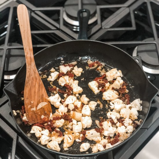 - Add sun-dried tomatoes, cauliflower and shallots to the pan. Cook, stirring, for 1 minute.