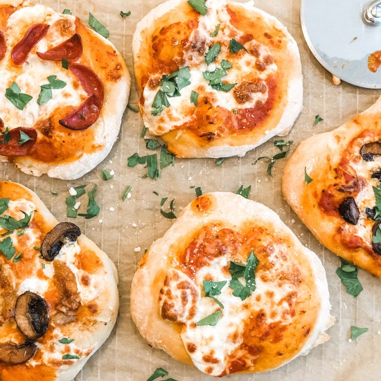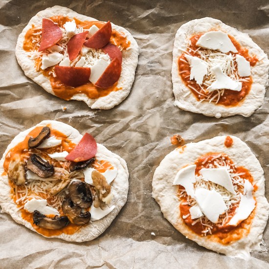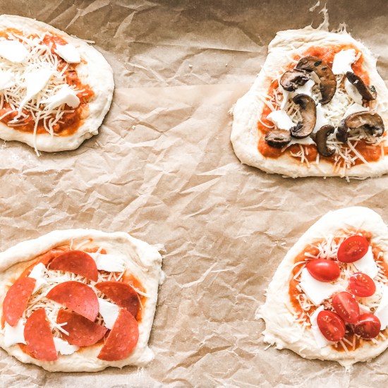 - Remove dough from bowl and place onto a well floured surface. Divide dough into 8 pieces and roll each of the mini doughs out. Place on a lined baking sheet and top each with toppings of your choice.