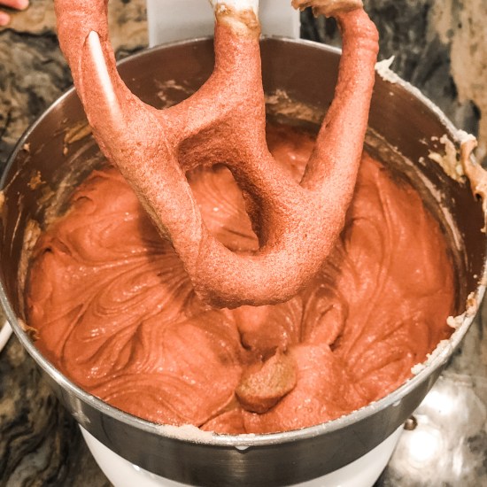 - With the stand mixer on low, add half the flour mixture into the wet ingredient mixture. When it’s mostly incorporated, add half the milk. Once incorporated, add the remainder of the flour mixture and then the remainder of the milk. Scrape the batter down from the sides to ensure the batter is properly mixed and mix until batter is smooth. Add food coloring and beat until well incorporated.