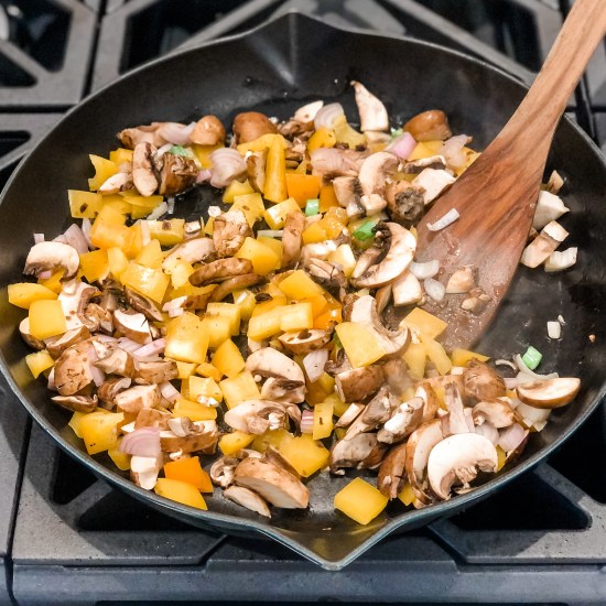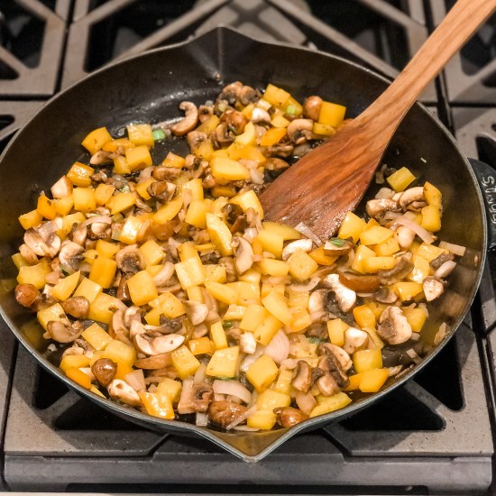 - In a large cast iron skillet or oven-safe non-stick skillet, warm the olive oil over medium-high heat until shimmering. Add the vegetables and cook for a few minutes, stirring occasionally. Cook until vegetables are tender. Season generously!