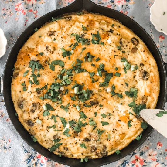 - Lower the heat to medium. Pour the whisked eggs over the vegetables. Once the outside edge of the frittata turns lighter in color (about 30 seconds to 1 minute), carefully transfer the frittata to the oven. Bake for about 10 minutes (keep an eye on it), until the eggs are puffed and appear cooked, and the center of the frittata jiggles just a bit when you give it a gentle shimmy. Remove the frittata from the oven and place it on a cooling rack to cool. Garnish with parsley & spring onions and enjoy!