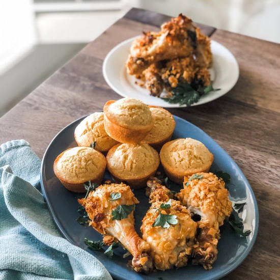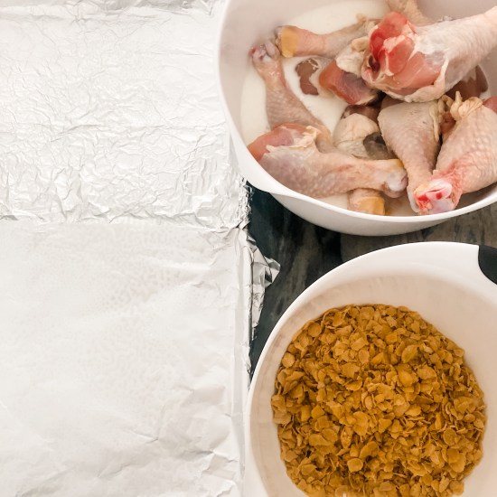Sometimes, I want cereal for dinner. And sometimes I want cereal in my dinner. Tonight was the later. I bought a ton of these massive drumsticks before Corona hit thinking we’d use them to bbq for a party, but we’re not having any of those these days (cough – stay 6 feet away, please!!).