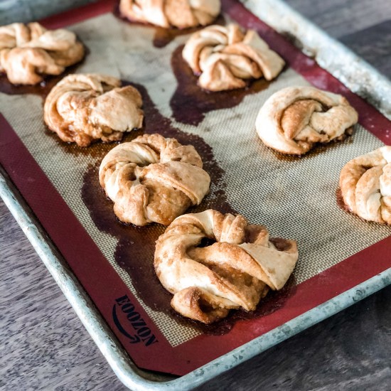 - Take one strip of folded dough. Hold both ends and twist. Tuck twisted dough into a knot. Set on parchment-lined baking sheet and repeat with remaining dough.