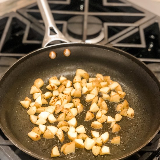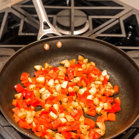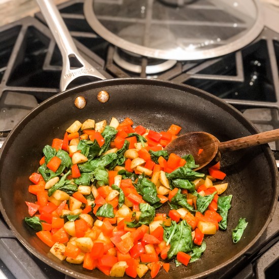 - In a large frying pan, saute chopped potatoes in 1 tablespoon oil until they begin to soften, about 5 minutes. Season with salt and pepper. Then, add in peppers and cook for 3-4 minutes. Season again with salt and pepper. Mix in the spinach and remove just as the leaves being to wilt. Season with salt and pepper for the last time and remove from heat. Set veggies aside.