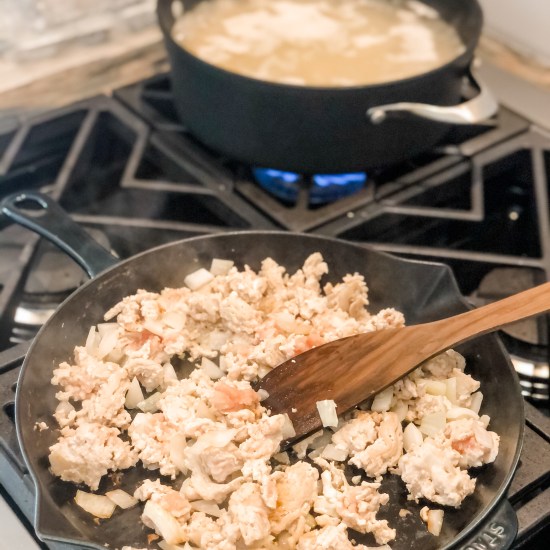 - In a large liquid measuring cup, combine the broth and milk. Whisk in the flour until the mixture is smooth and there are no lumps of flour remaining. Stir the broth/milk mixture into the turkey mixture and cook over medium or medium-high heat, stirring occasionally.