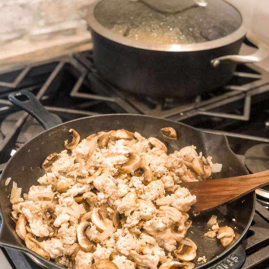 - In a large nonstick skillet, cook the turkey, onion, garlic, salt and pepper, on medium-high heat, stirring occasionally to break up the meat into small pieces, until it’s almost cooked through but still slightly pink, about 5 minutes. Add sliced mushrooms and cook until the mushrooms are soft and browned and the meat is cooked through, another 5 minutes or so.