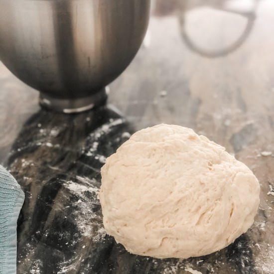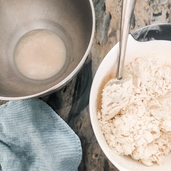 - When the yeast is foamy and smells like bread, add the milk, yogurt, flour, baking powder, baking soda, and salt and mix the with a wooden spoon until the dough comes together. As soon as it comes together, stop kneading. It should be sticky, but should form a ball and be soft. Cover the bowl with a damp towel or plastic wrap and let sit in a warm place 1 hour or if not using right away overnight in the fridge.
