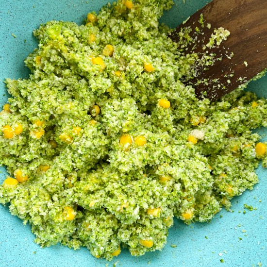 - In a large bowl, mix broccoli, corn, egg, flour, cheese, garlic powder, salt and pepper.