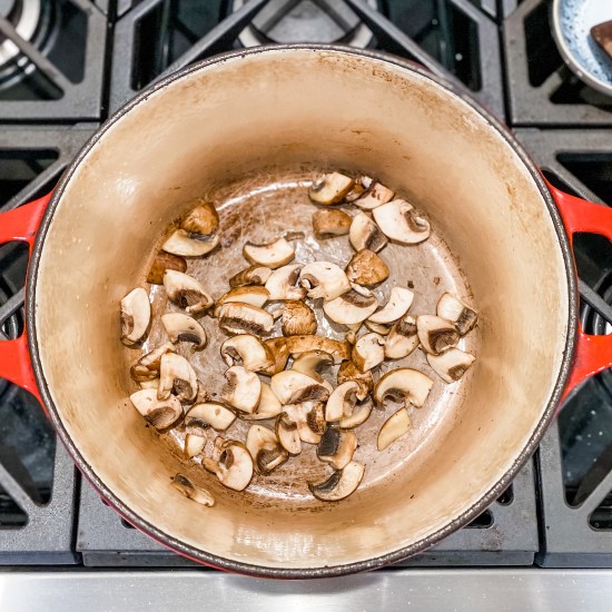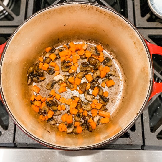 - Heat a large Dutch oven or similar deep, heavy-bottomed pan over medium-high heat. Add the oil to the pan. Once hot, add the mushrooms and cook for 8 minutes, until mushrooms are beginning to brown, stirring occasionally. Add the carrots, garlic powder, salt, and pepper. Cook until the mushrooms have browned more deeply and the carrots begin to soften, about 3 additional minutes.