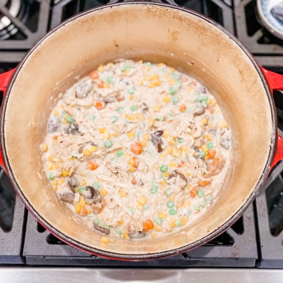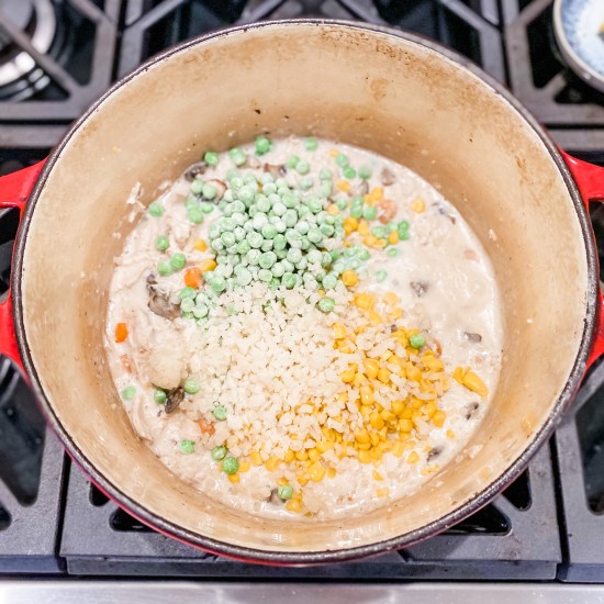 - Sprinkle the flour over the top of the vegetables and cook 2 minutes. Slowly pour in the milk, adding a few splashes at a time, stirring constantly. Bring to a low boil, scraping any brown bits from the bottom of the pan. Continue to let bubble until thickened, about 3 to 5 minutes. Stir in the chicken, peas, cauliflower, and thyme. Spoon the chicken mixture into the prepared pie dish.