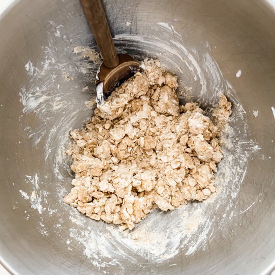- In a separate medium mixing bowl, stir together the oats, flour, brown sugar and salt. Mix in the butter and yogurt. Stir until well combined.