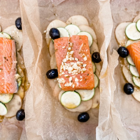 - Prepare 4 large pieces of parchment paper by laying them flat on a clean work surface. Layer 1/4 of the potato slices in an even layer about the size of your fish on the bottom of 1 parchment paper. Season generously with salt and pepper. Next, layer 1/4 of zucchini slices on top of the potato and season generously with salt and pepper again. Place one piece of salmon on top of the zucchini and drizzle with oil mixture. Scatter a few olives around the fish. Repeat with remaining parchment packets and ingredients.