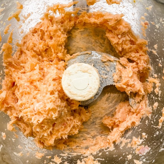 1. Coarsely chop salmon and place half in a food processor (if you prefer it less chunky, put all of the salmon in the food processor). Add lemon juice and mustard. Process, scraping down the sides as necessary, until just smooth (try not to over puree it or it will become dense). Add the remaining salmon, bell pepper, shallot, 1/4 teaspoon salt and pepper and pulse until the mixture is combined but still chunky.