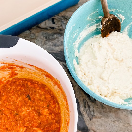 - In a large bowl, mix eggs, ricotta, half the mozzarella, half the Parmesan, parsley, salt and pepper until well combined.