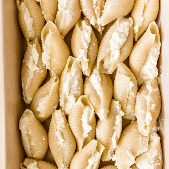 - Stuff cooked shells with ricotta mixture and place in a 9×13 inch baking dish.