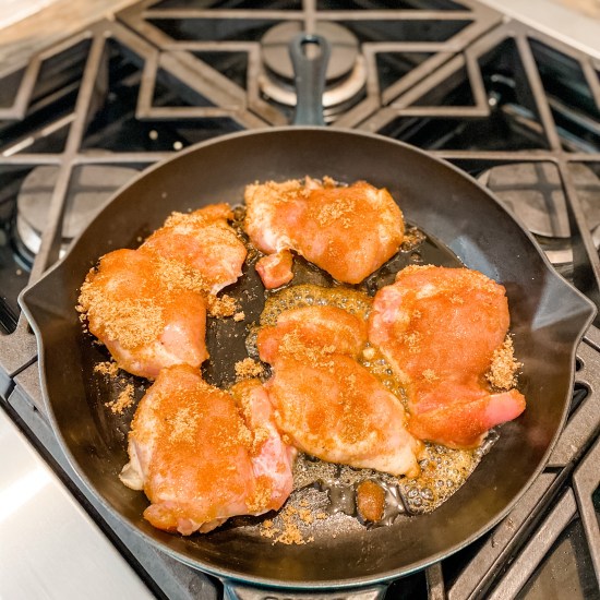 - Place the chicken thighs on a cutting board and pat dry with a paper towel. Sprinkle the brown sugar mixture over the chicken, coating both sides liberally.