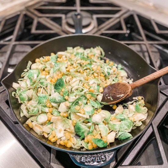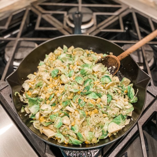 2. Add the Brussel sprouts and stir. Cook for 5 minutes and add corn. Mix and let cook for another 5 minutes, or until veggies have softened (while sprouts are cooking, make rice according to packaging) .