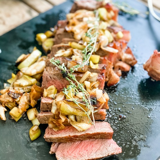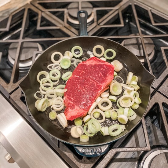 Pan-Seared NY Strip Steak with Leeks