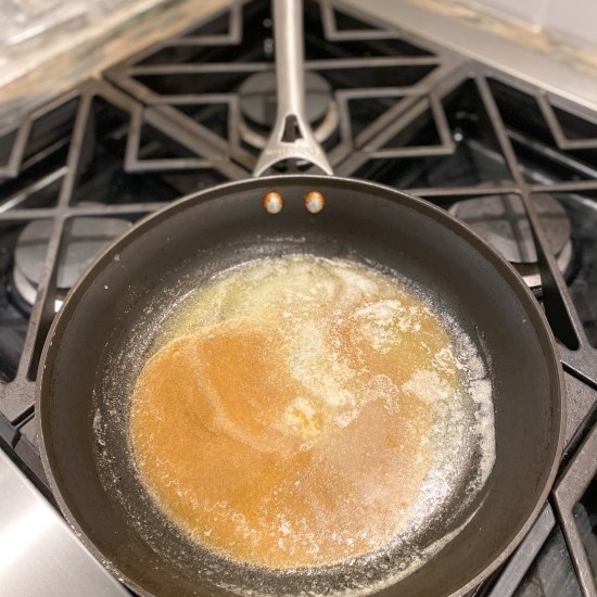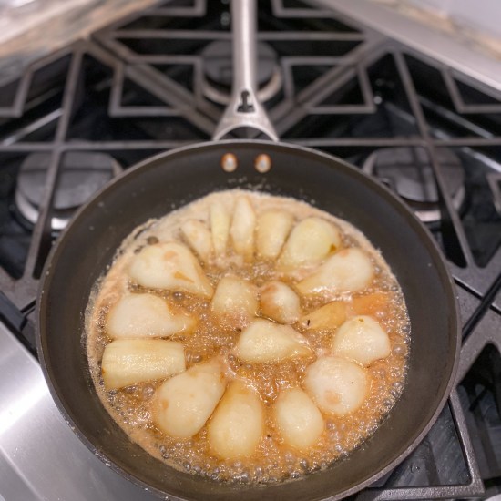- Place over medium heat and cook for 7-10 minutes shaking the pan occasionally to stop the pears from sticking, until the butter and sugar caramelize and turn toffee-colored and the pears are just tender.