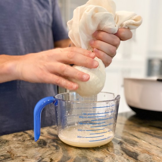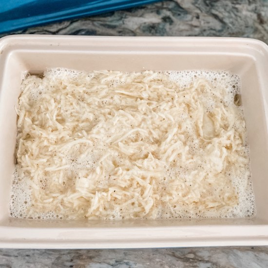 - Lay 1/4 of the grated onion and potato on a large triple layer of cheesecloth or clean, lint-free kitchen towel. Gather the corners and tie around the handle of a wooden spoon. Dangle the bundle over a medium bowl, then twist and squeeze the onion and potatoes as hard as you can until no more liquid comes out. Do not discard the liquid. Transfer the onion and potatoes to a clean, large bowl. Repeat this squeezing process with the rest of the grated onion and potato, replacing the cheesecloth if it tears.