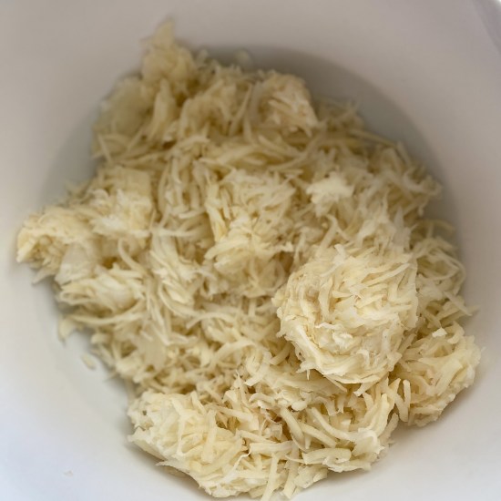- Using the shredding disk of the food processor, shred the onions and potatoes (you will likely have to do this in 4 batches, simply transfer each batch of shredded onion and potato to a large bowl while you continue shredding).