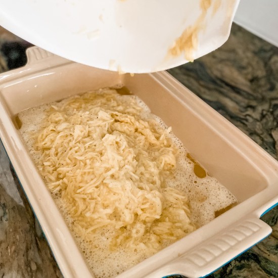 But, what is kugel you ask? It’s basically a thick hash brown or shredded french fry cake. It’s one of those dishes you can eat for breakfast, brunch, lunch, lunner or dinner. It’s so versatile! Yes, it takes time to make but the effort is worth it with this one!
