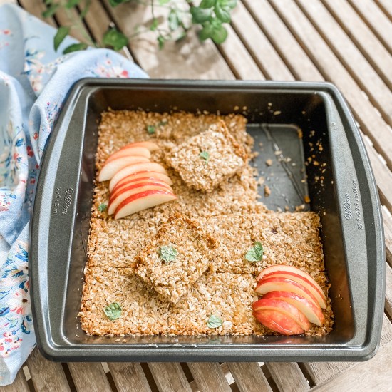 - Lightly butter an 8×8 baking tin and add the mixture. Press into the corners with the back of a spoon so the mixture is flat and score into 12 squares. Bake for around 15 mins until golden brown. Enjoy!