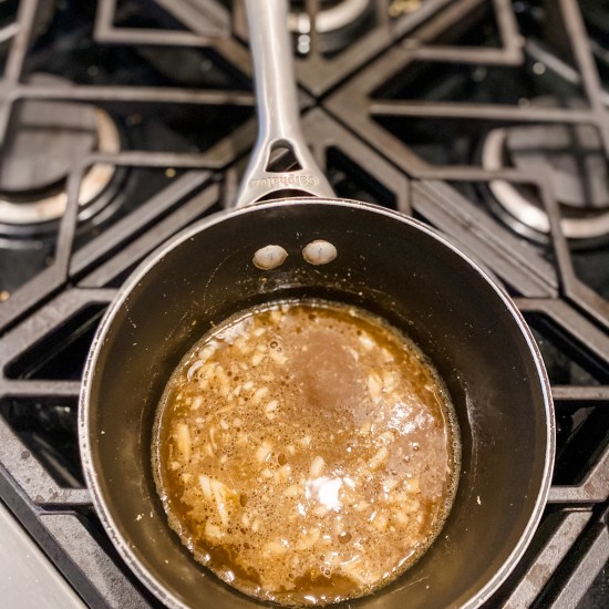 - In a small saucepan, bring orange juice, ginger, garlic, soy sauce, honey rice vinegar and sesame oil to a boil. Whisk until the sauce starts to thicken slightly.