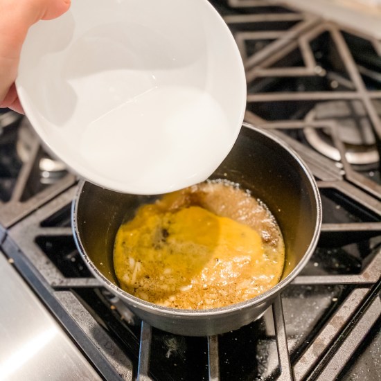 - Mix the cornstarch and water together and pour into the boiling sauce, whisking until the sauce thickens more.