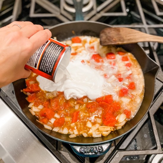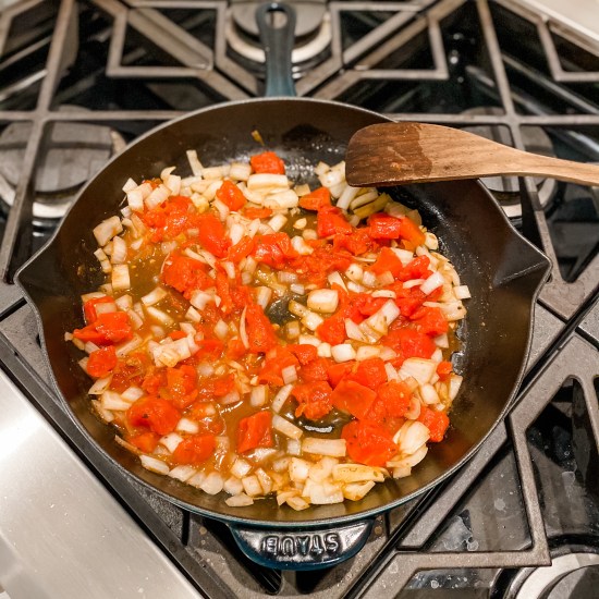 Add remaining olive oil to the skillet; add onions to the heated oil and cook for 2 to 3 minutes, or until tender and translucent. Stir in garlic and cook for 30 seconds. Add tomatoes and continue to cook for 5 minutes, or until tomatoes are soft. Stir in the coconut milk and bring to a simmer; let simmer for 5 minutes, or until sauce thickens.