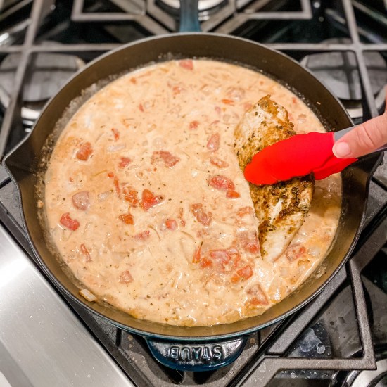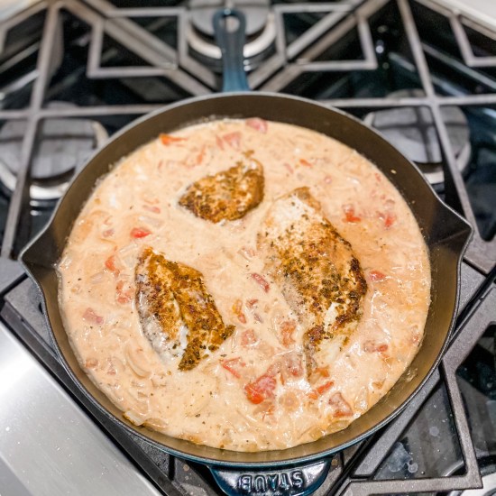 Return chicken breasts to the skillet; reduce heat to medium-low and cook for 4 to 5 more minutes, or until chicken is cooked through. Chicken is done when internal temperature registers at 165 degrees.