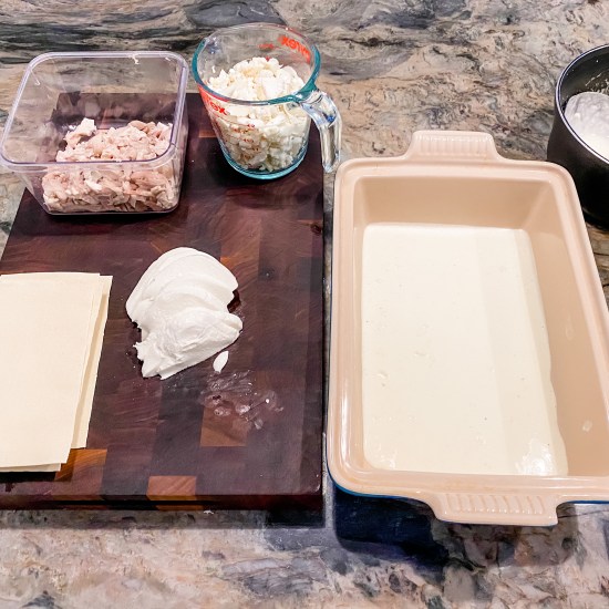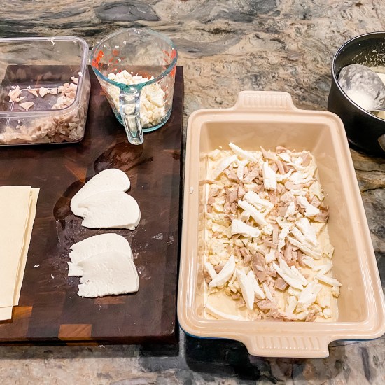 - Spread a generous spoonful of sauce on the bottom of a 9×13 inch pan and cover with 3 cooked lasagna noodles. Follow with a layer shredded chicken, cauliflower, and mozzarella. Add more sauce, and repeat to make another layer. On top of the last noodle layer, cover with the remainder of the sauce, and mozzarella.
